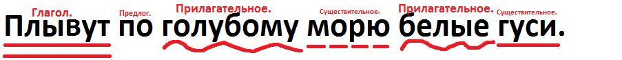 Подскажите пожалуйста разбор предложения ,найти части речи ,главные члены предложения,словосочетание, и второстепенные члены предложения.Плывут по голубому морю белые гуси.