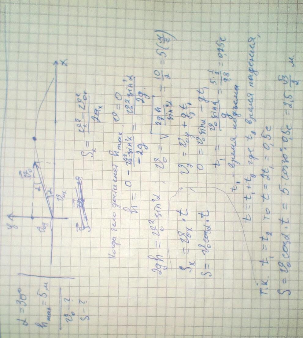 Камень был брошен под углом 30° к горизонту. Его максимальная высота - 5м. Найдите начальную скорость и путь