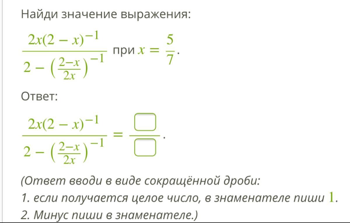 x=\frac{5}{7}\\\\\\\frac{2x\, (2-x)^{-1}}{2-(\frac{2-x}{2x})^{-1}}=\frac{2x}{(2-x)\cdot (2-\frac{2x}{2-x})}=\frac{2x\, (2-x)}{(2-x)\cdot (2(2-x)-2x)}=\frac{2x}{4-2x-2x}=\\\\=\frac{2x}{4-4x}=\frac{2x}{4(1-x)}=\frac{x}{2(1-x)}=\frac{\frac{5}{7}}{2\, (1-\frac{5}{7})}=\frac{5}{7\cdot 2\cdot \frac{7-5}{7}}=\frac{5}{4}