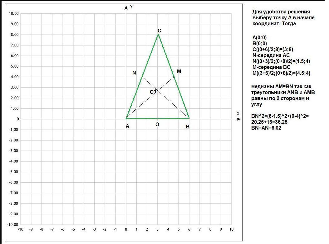 В координатной системе находится равнобедренный треугольник ABC (AC=BC). Проведены медианы AN и BM к боковым сторонам треугольника. Длина стороны AB = 6, а высоты CO = 8.