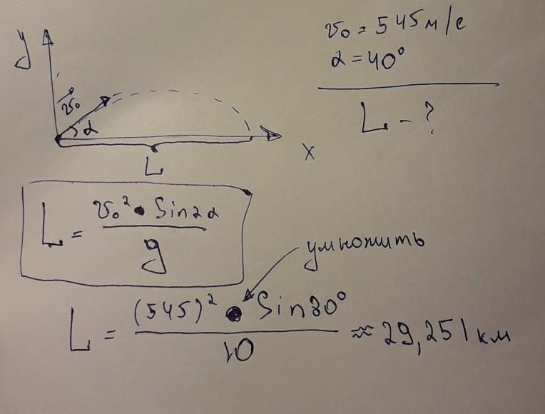 Из ствола орудия вылетает снаряд под углом 40 градусов к горизонту со скоростью 545 м/с, масса орудия 1318 кг, длина ствола 2695 мм, калибр 77 мм, рассчитайте дальность стрельбы
