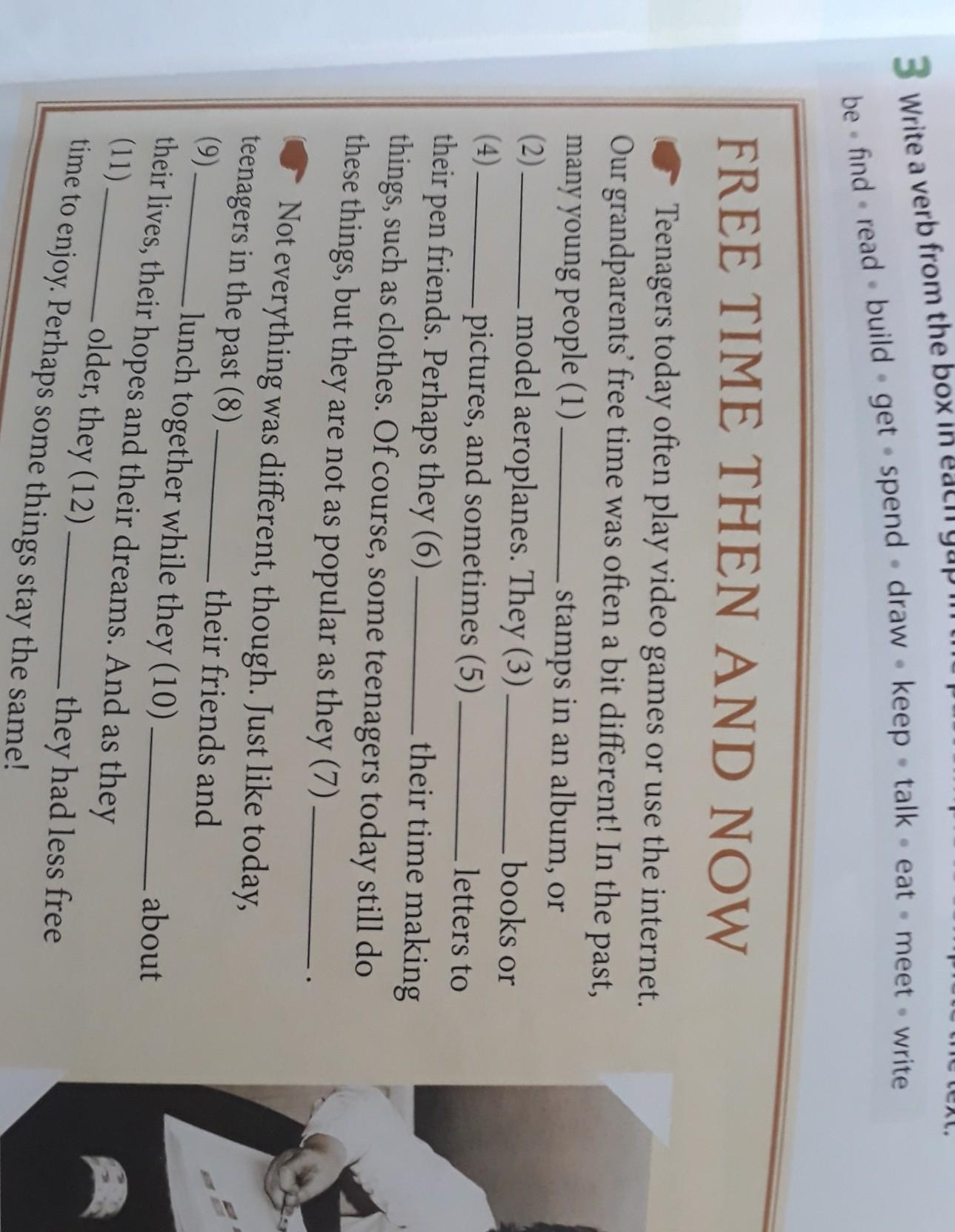 Teenagers today often play video games or use the internet. Our grandparents' free time was often a bit different! In the past, many young people (1) kept stamps in an album, or (2) built model aeroplanes. They (3) read books or (4) drew pictures, and sometimes (5) wrote letters to their pen friends. Perhaps they (6) spent their time making things, such as clothes. Of course, some teenagers today still do these things, but they are not as popular as they (7) were. Not everything was different, though. Just like today, teenagers in the past (8) met their friends and (9) ate lunch together while they (10) were talking about their lives, their hopes and their dreams. And as they (11) were getting older, they (12) found they had less free time to enjoy. Perhaps some things stay the same!