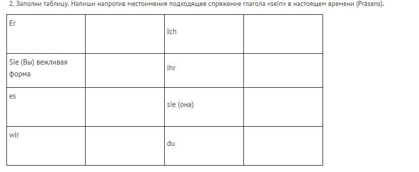 Заполни таблицу. Напиши напротив местоимения подходящее спряжение глагола «sein» в настоящем времени (Präsens).