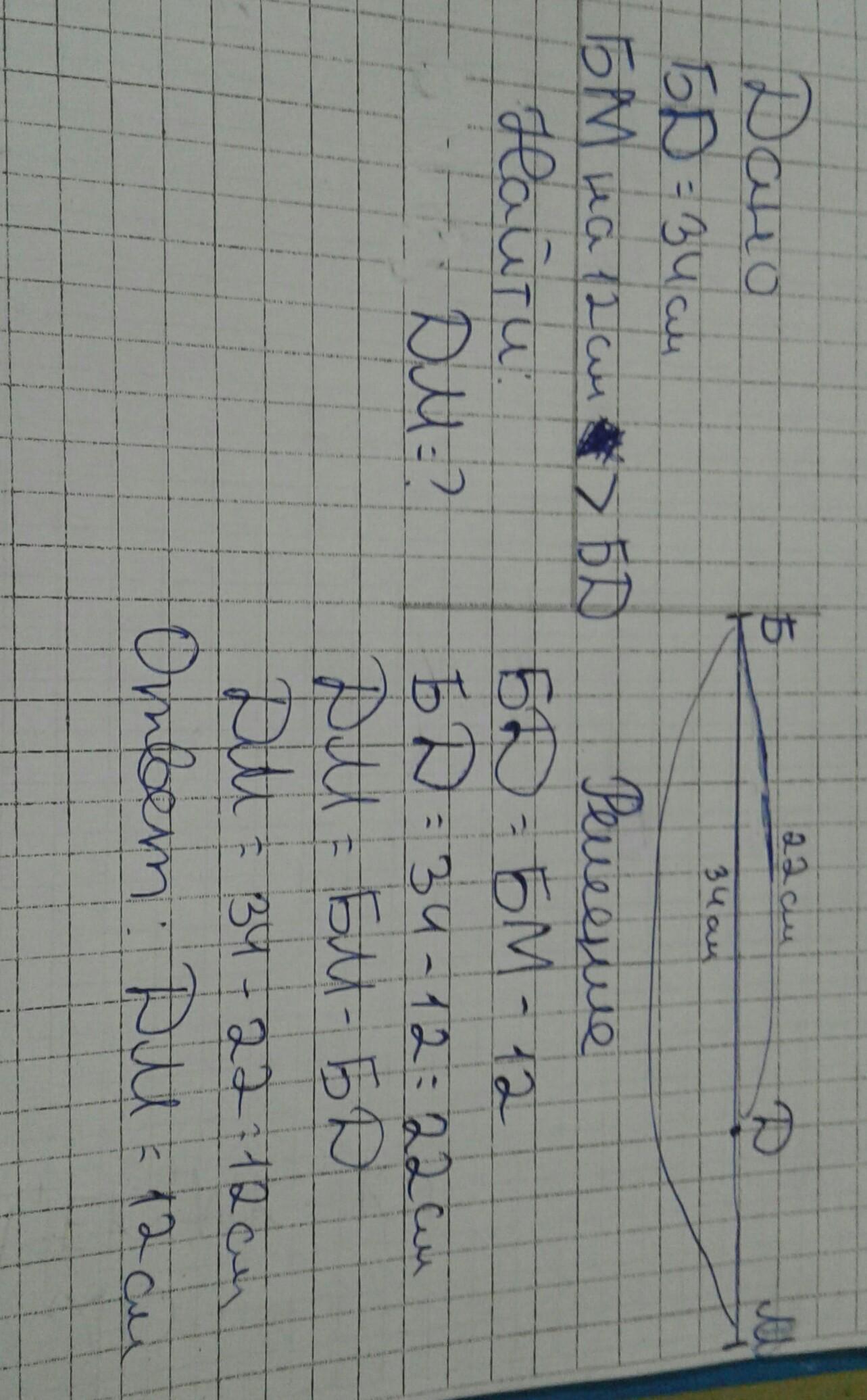 найдите длины отрезков БМ и дм если БД равен 34 см а отрезок БМ на 12 см больше отрезка БМ
