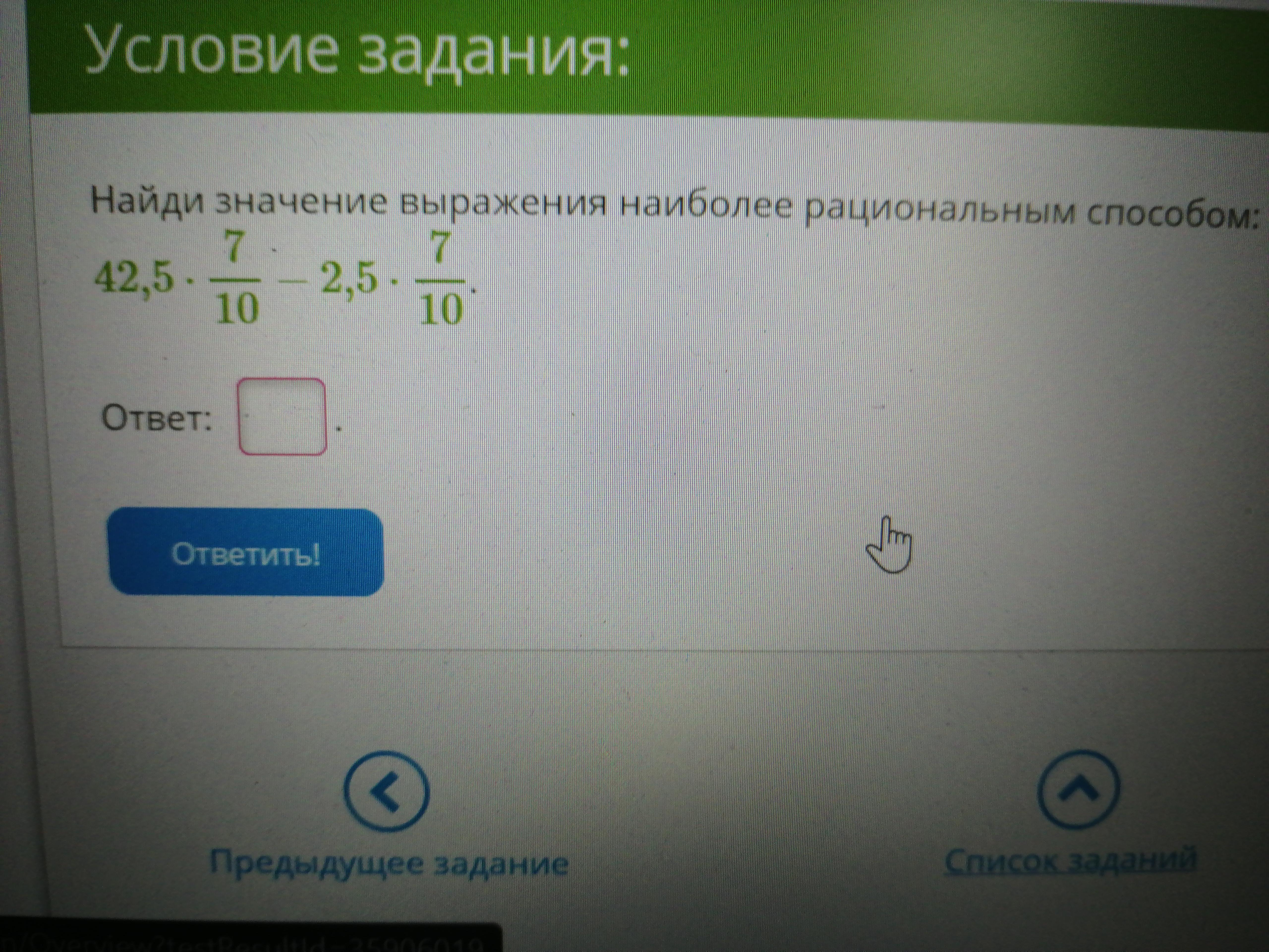 4,25*\frac{7}{10}-2,5*\frac{7}{10}=\frac{7}{10}(4,25-2,5)=0,7*1,75=1,225\\\\Otvet:\boxed{1,225}
