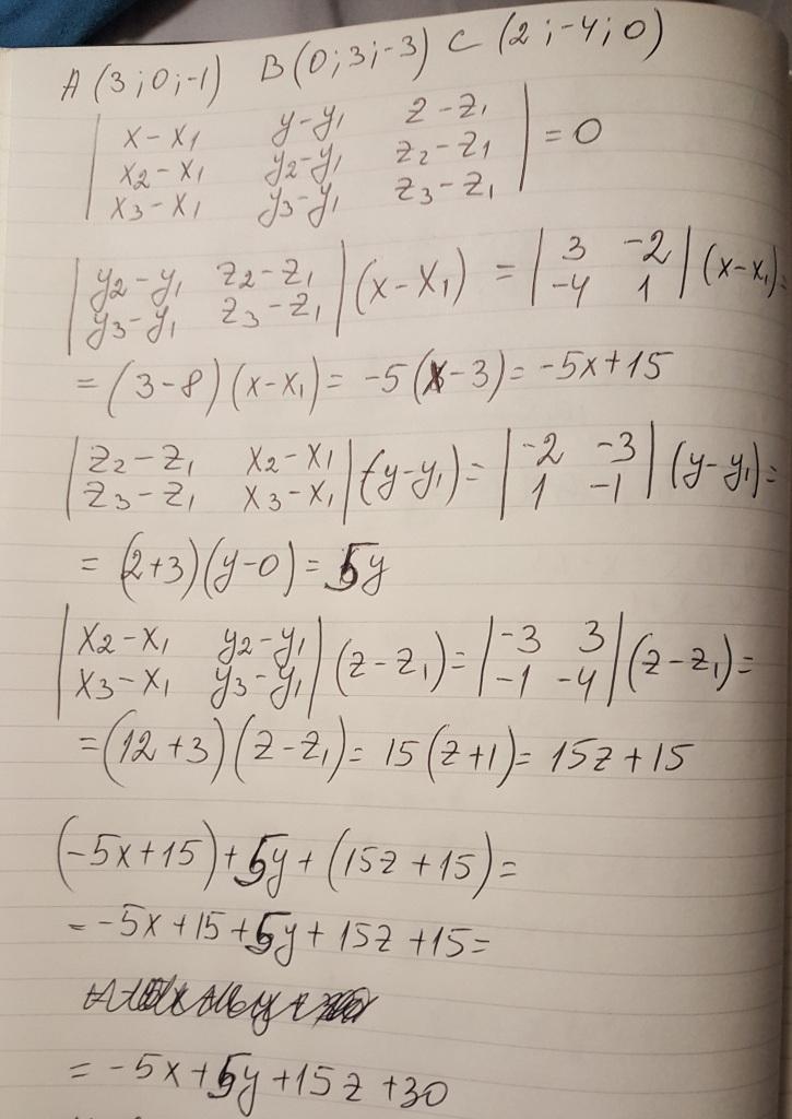 Пусть (х1, х2, х3), (у1, у2, у3) и (z1, z2, z3) – координаты первой, второй и третьей точки соответственно. (x-x1)*(у2-y1)*(z3-z1) – (x-x1)*(z2-z1)*(y3-y1) – (y-y1)*(x2-x1)*(z3-z1) + (y-y1)*(z2-z1)*(x3-x1) + (z-z1)*(x2-x1)*(y3-y1) – (z-z1)*(y2-y1)*(x3-x1) = 0.
