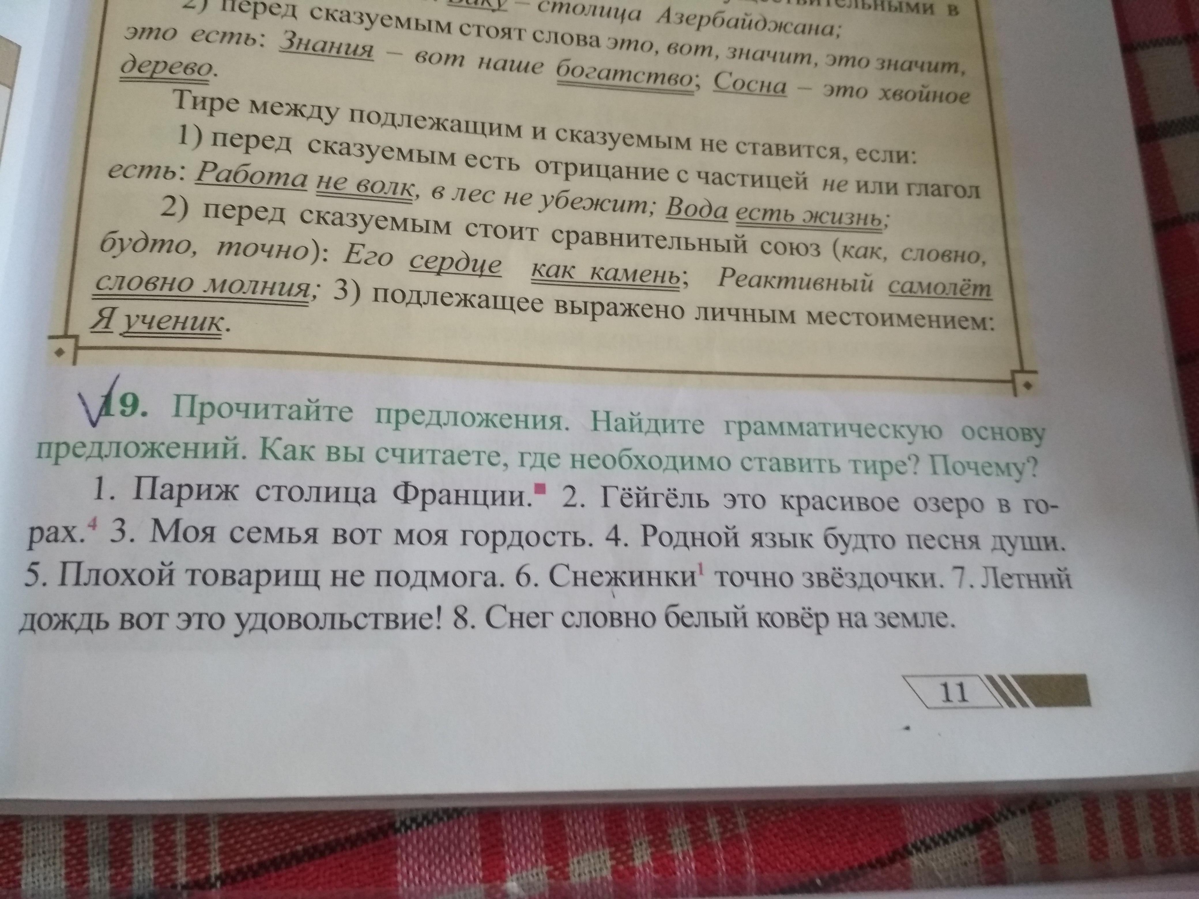 Париж - столица Франции ( Париж - подлеж, Франции - сказуем.) Тире ставим потому,что подлжащее и сказуемое выражены существительным. Гёйгёль - это красивое озеро в горах (Гёйгёль - подлеж , озеро - сказ). Подлежащее и сказуемое выражены существительным. Моя семья - моя гордость ( семья - подлеж. гордость - сказ.) тире ставим изза того,что выражены существительными