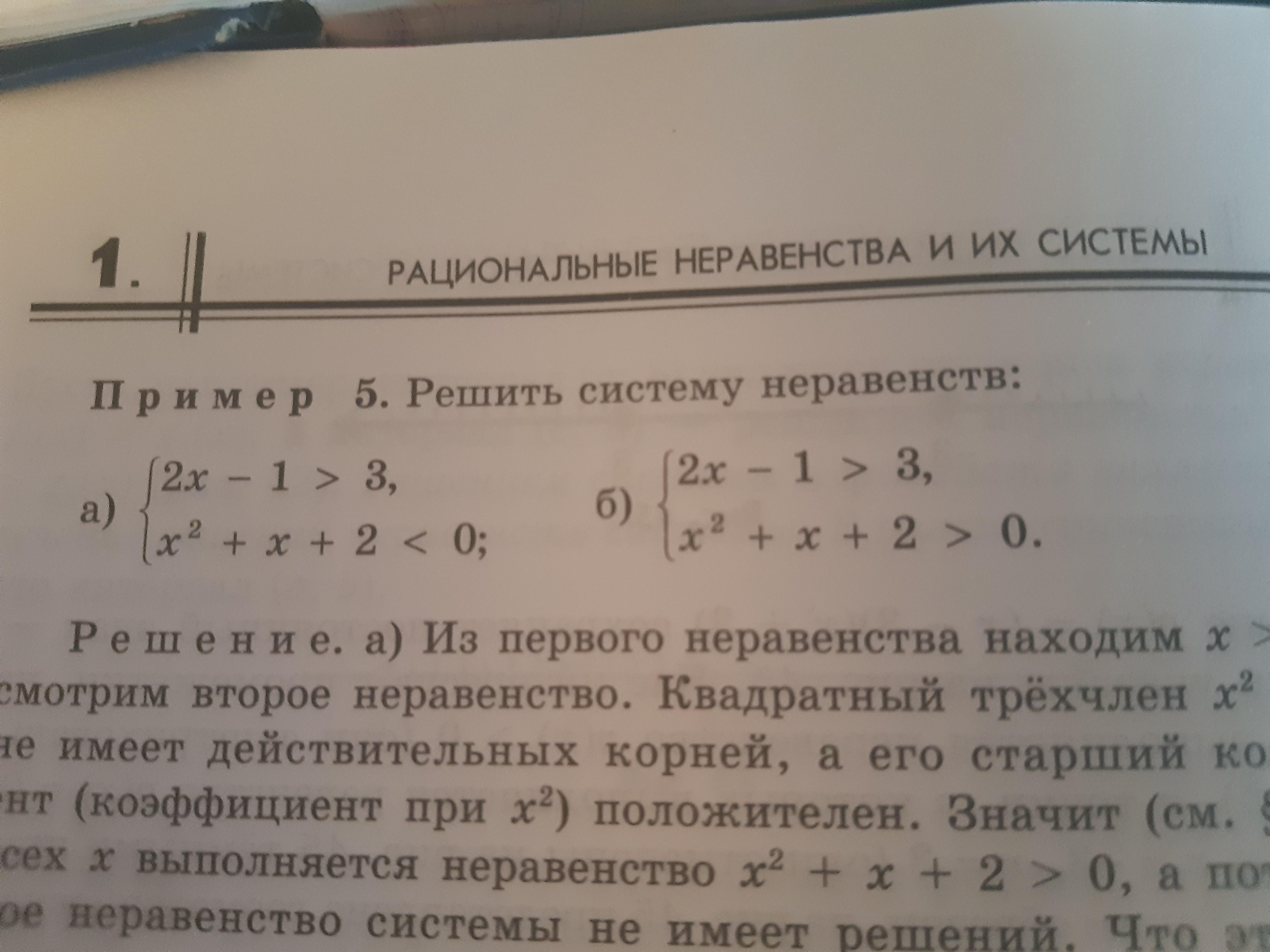 Если аналитически, то старший коэффициент равен 1, т.е. ветви параболы направлены вверх, а дискриминант равен 1+8=-7 отрицателен, значит у уравнения нет корней. и для любого х выражение больше нуля. а в системе оно меньше нуля. во второй же системе подходит любой х, из второго неравенства, а в первом икс больше двух.