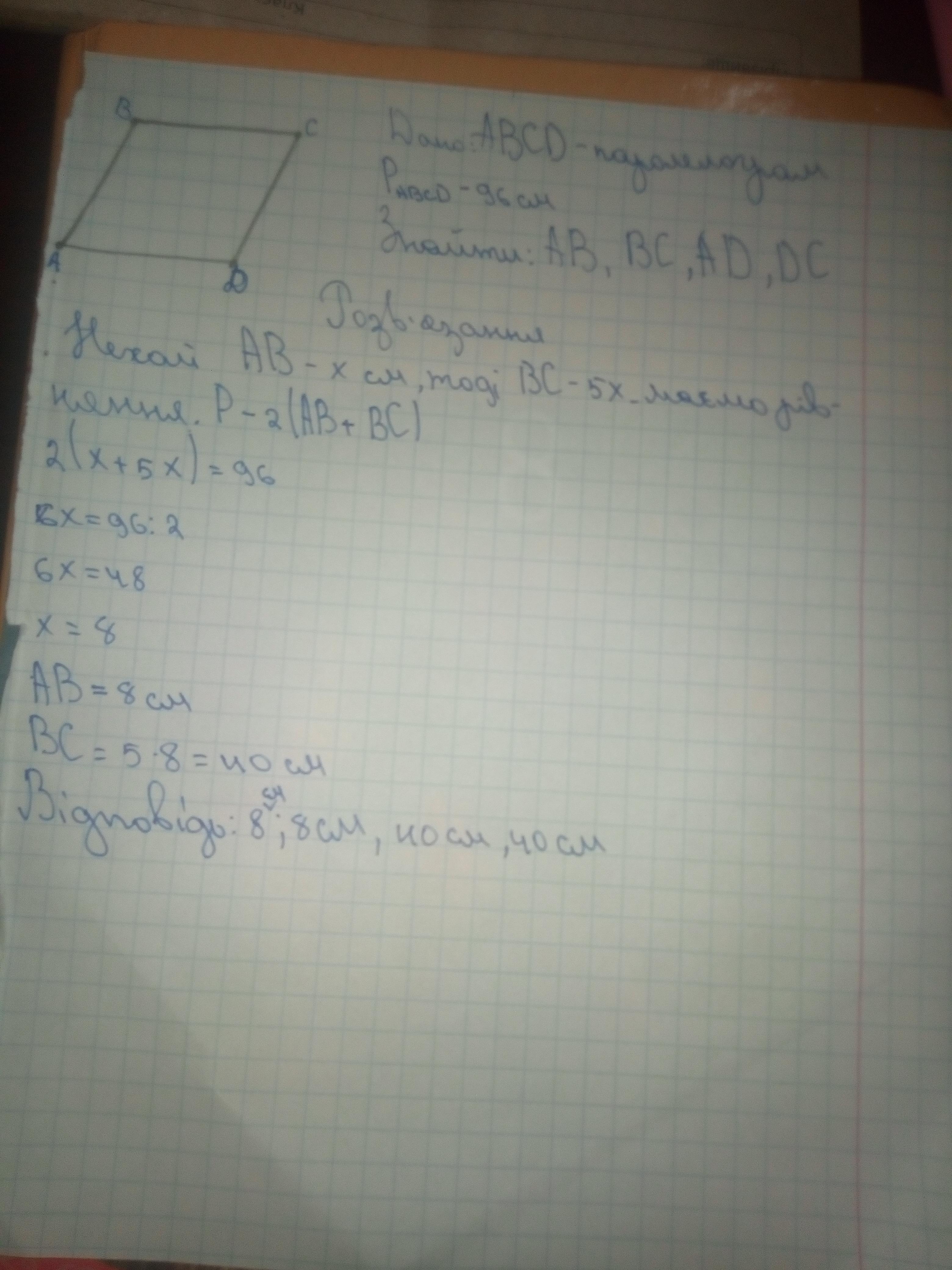 Знайдіть сторони паралелограма якщо одна з них у 5 разів більша за другу а периметр паралелограма дорівнює 96 см