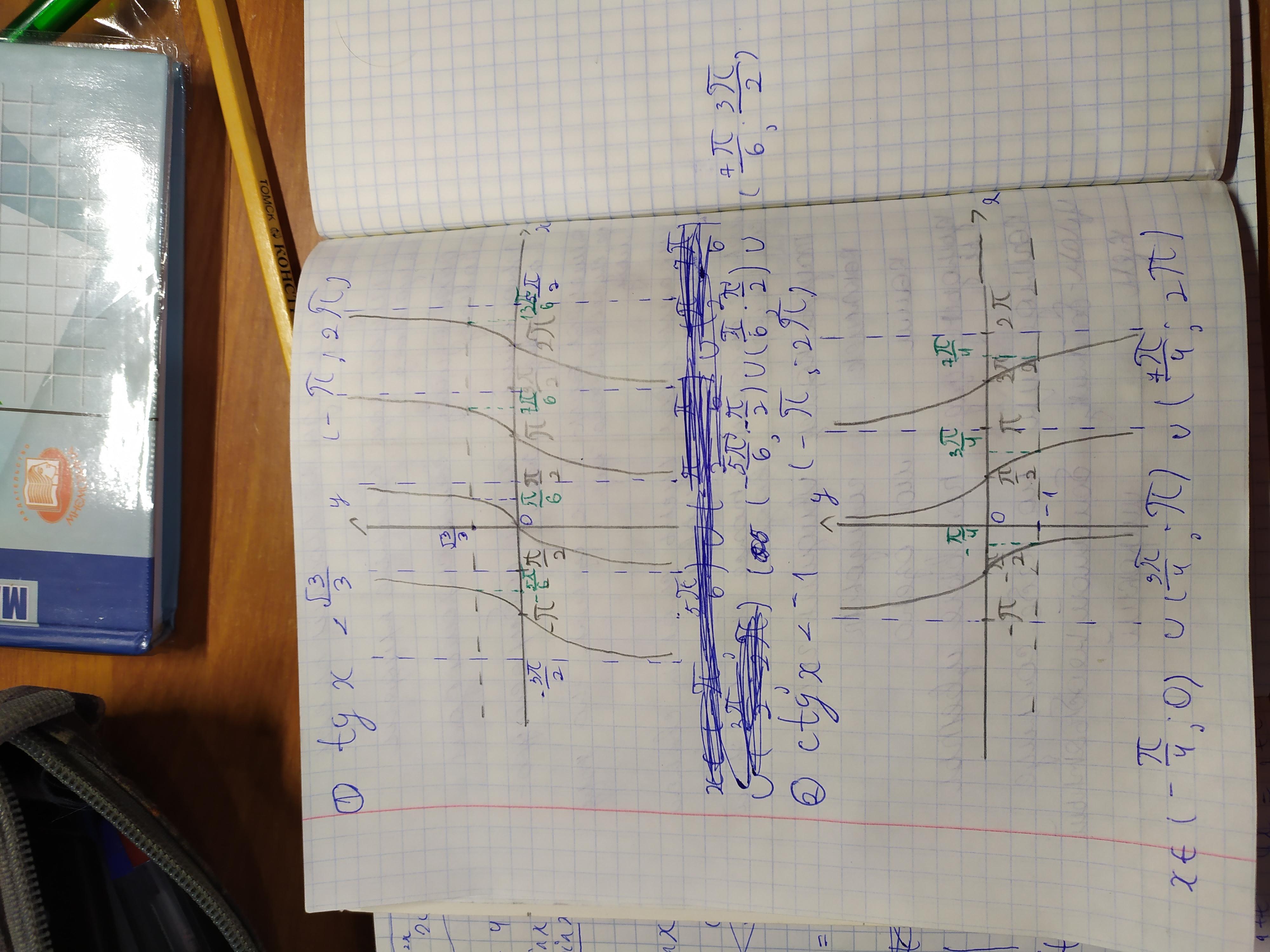 Я сделал графики функций tg x и ctg x, отметил значения √3/3 и -1 по оси OY. Прямые y = ✓3/3 и y = -1 нужны, чтобы показать значения x, принимающие эти значения.