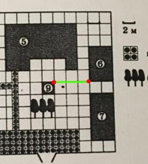 Зелёная линия равна трём клеткам, в задании указано, что сторона одной клетки два метра, значит расстояние от фонтана до бани равно: