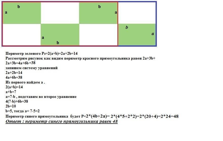 Мистер Фокс нарисовал 4 зелёных прямоугольника, один синий и один красный прямоугольник. Периметр каждого зелёного прямоугольника равен 14, периметр красного прямоугольника 38. Чему равен периметр синего прямоугольника?