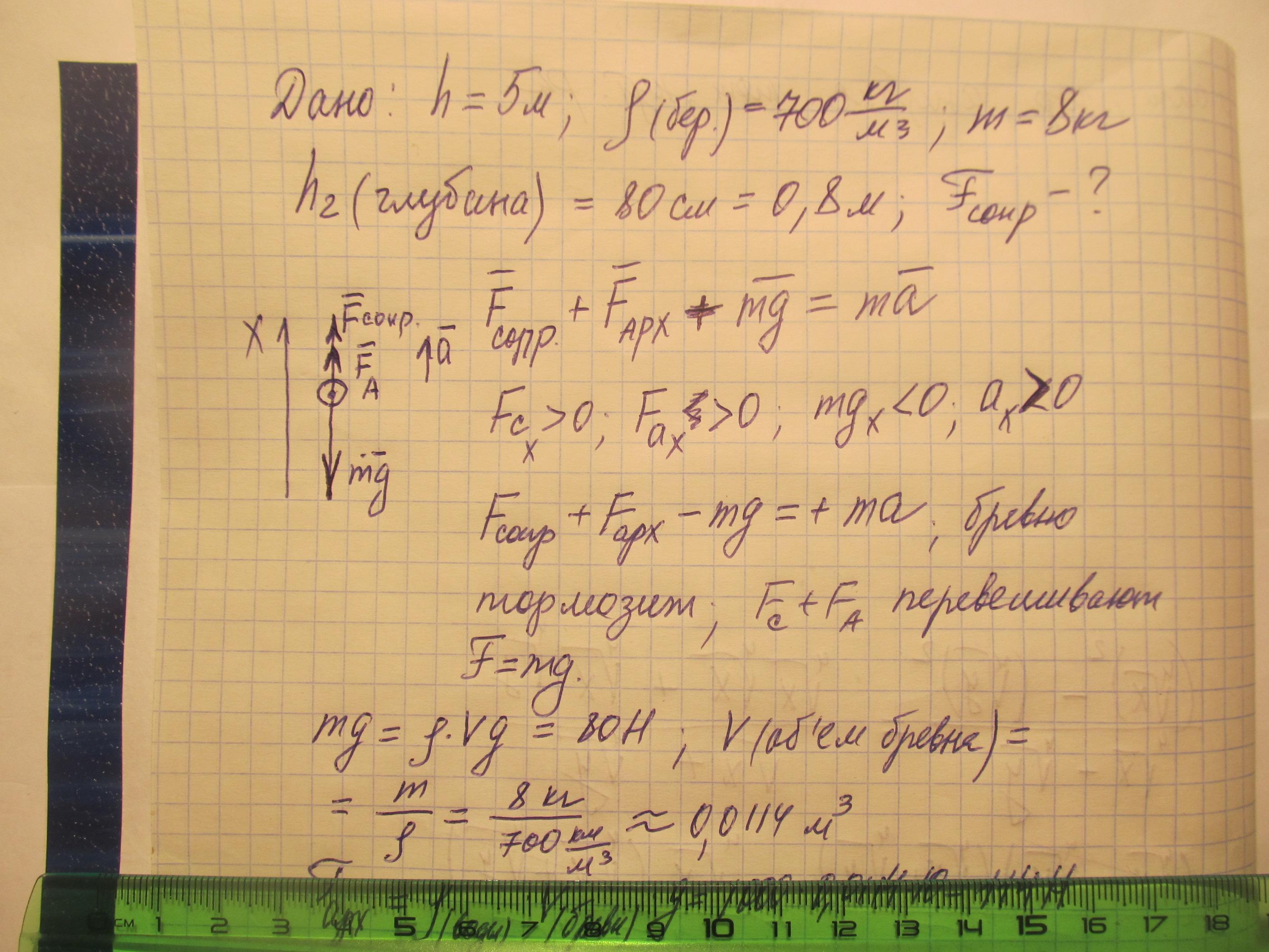 Упав в пруд с высоты 5 метров , березовое полено массой 8кг погрузилось в в воду на 80 см. Какова средняя сопротивляемость воды? С рисунком и решением. Умоляю , помогите .