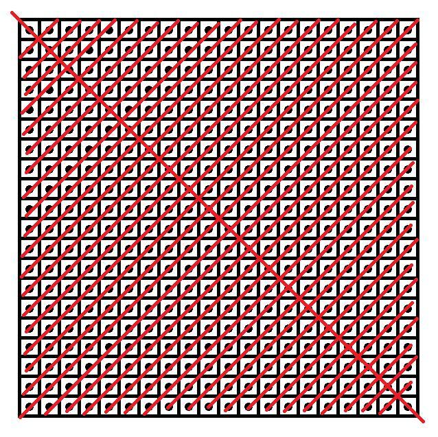 Если не считать угловые стороны то надо (20 - 2) = 18 диагоналей которые идут с низу к правой стороне. Также 18 диагоналей, идущих с левой стороны к верху. И 2 диагонали которые идут через угловые стороны.