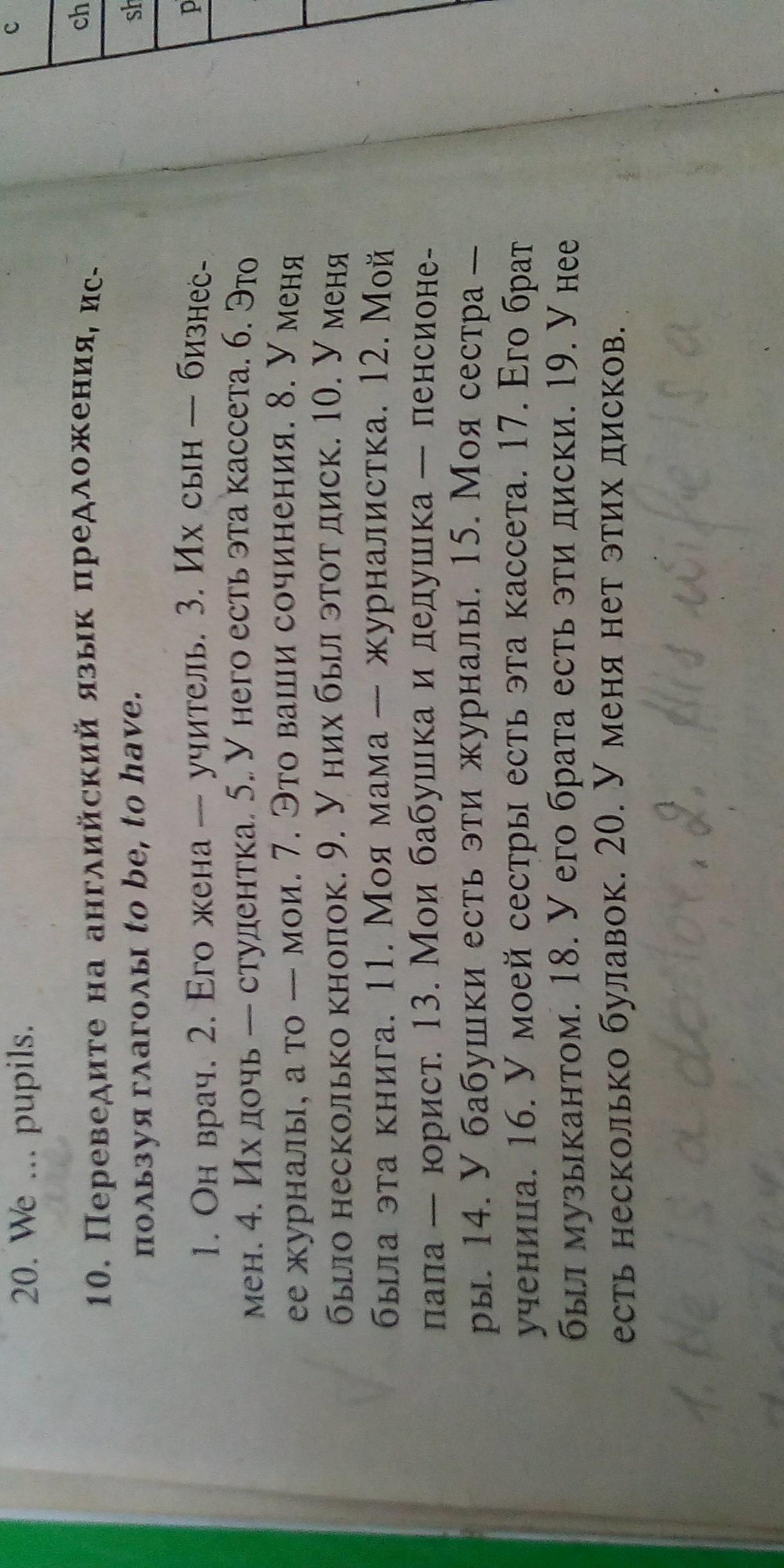 1) He is a doctor. 2) His wife is a teacher. 3) Their son is businessman. 4) Their daughter is a student. 5) He has a tape. 6) These are her magazines, those mine. 7) These are your essays. 8) I had a few buttons. 9) They had this disk. 10) I had this book. 11) My mother is a journalist. 12) My father is a lawyer. 13) My grandparents pensioners. 14) My grandmother has these magazines. 15) My sister is a pupil. 16) My sister has this tape. 17) His brother was musician. 18) His brother has this disks. 19) She has some pins. 20) I have not this pin.