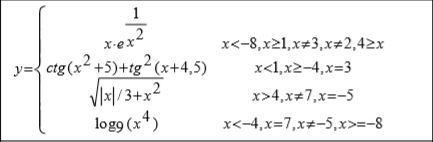 В B14 пишем формулу =A14*EXP(1/A14^2)*(ЦЕЛОЕ((2-ЗНАК(A14-4))/2)*ЦЕЛОЕ((2+ЗНАК(A14-1))/2)*ABS(ЗНАК(A14-3))*ABS(ЗНАК(A14-2))+ЦЕЛОЕ((1-ЗНАК(A14+8))/2))+(1/TAN(A14^2+5)+(TAN(A14+4,5))^2)*(ЦЕЛОЕ((1-ЗНАК(A14-1))/2)*ЦЕЛОЕ((2+ЗНАК(A14+4))/2)+1-ABS(ЗНАК(A14-3)))+(ABS(A14)/3+A14^2)^0,5*(ЦЕЛОЕ((1+ЗНАК(A14-4))/2)*ABS(ЗНАК(A14-7))+1-ABS(ЗНАК(A14+5)))+LOG(A14^4;9)*(ЦЕЛОЕ((1-ЗНАК(A14+4))/2)*ЦЕЛОЕ((2+ЗНАК(A14+8))/2)*ABS(ЗНАК(A14+5))+1-ABS(ЗНАК(A14-7)))