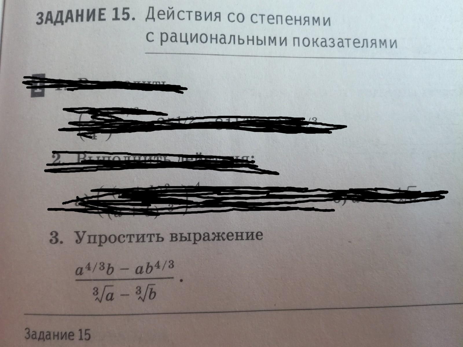\displaystyle \frac{a^{4/3}b-ab^{4/3}}{\sqrt[3]{a}-\sqrt[3]{b}}=\frac{a^{\frac{4}{3}}b-ab^{\frac{4}{3}}}{\sqrt[3]{a}-\sqrt[3]{b}}=\frac{ab(a^{\frac{1}{3}}-b^{\frac{1}{3}})}{a^{\frac{1}{3}}-b^{\frac{1}{3}}}=ab
