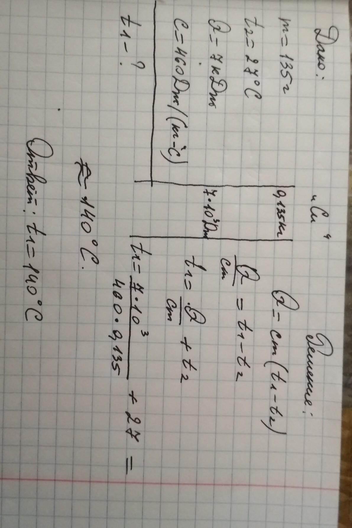 При охлаждении куска железа массой 135 г до температуры 27°С выделилось 7 кДж теплоты. Определи, какой