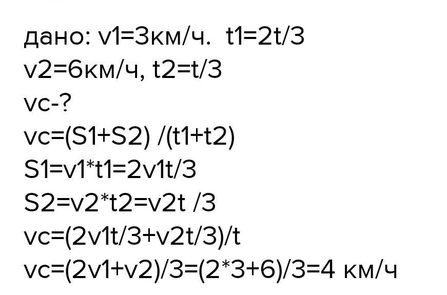 Пешеход часть прошёл со скоростью 3 км ч затратив на это 2/3 времени своего движения.оставшееся время он прошёл со скоростью 6 ки с определите среднюю скорость