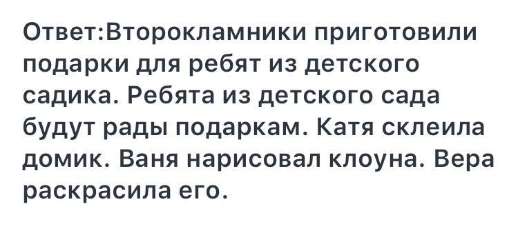 Второклассники(подлежащее) приготовили(сказуемое). Ребята(подлежащее) будут рады(составное сказуемое). Катя(подлежащее) склеила(сказуемое). Ваня(подлежащее) нарисовал(сказуемое). Вера(подлежащее) раскрасила(сказуемое). Подлежащее подчёркивается одной чертой, сказуемое - двумя чертами.