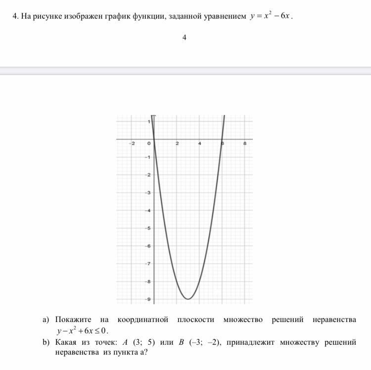 b) Подставляя координаты точек A и B в неравенство y-x²+6*x≤0, находим, что координаты точки А ему не удовлетворяют, а координаты точки B - удовлетворяют. Поэтому множеству решений принадлежит только точка B.