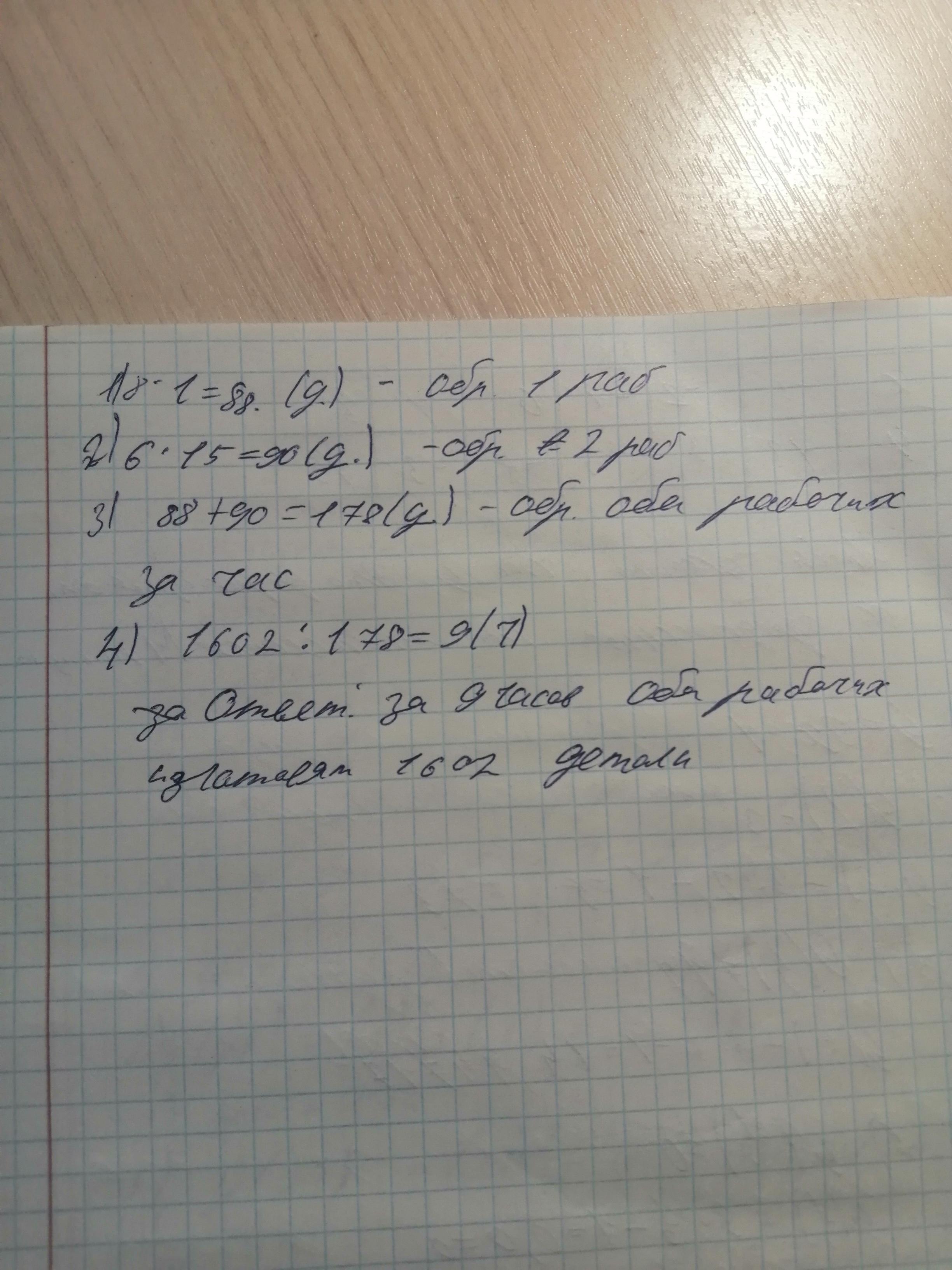 Как записать задачу?:Двое рабочих изготавливали одинаковые детали. Один обслуживал 8 станков, обрабатывающих по 11 деталей в час каждый, а другой обслуживал 6 станков, обрабатывающий по 15 деталей в час каждый. За сколько часов они изготовят вместе 1602 детали?