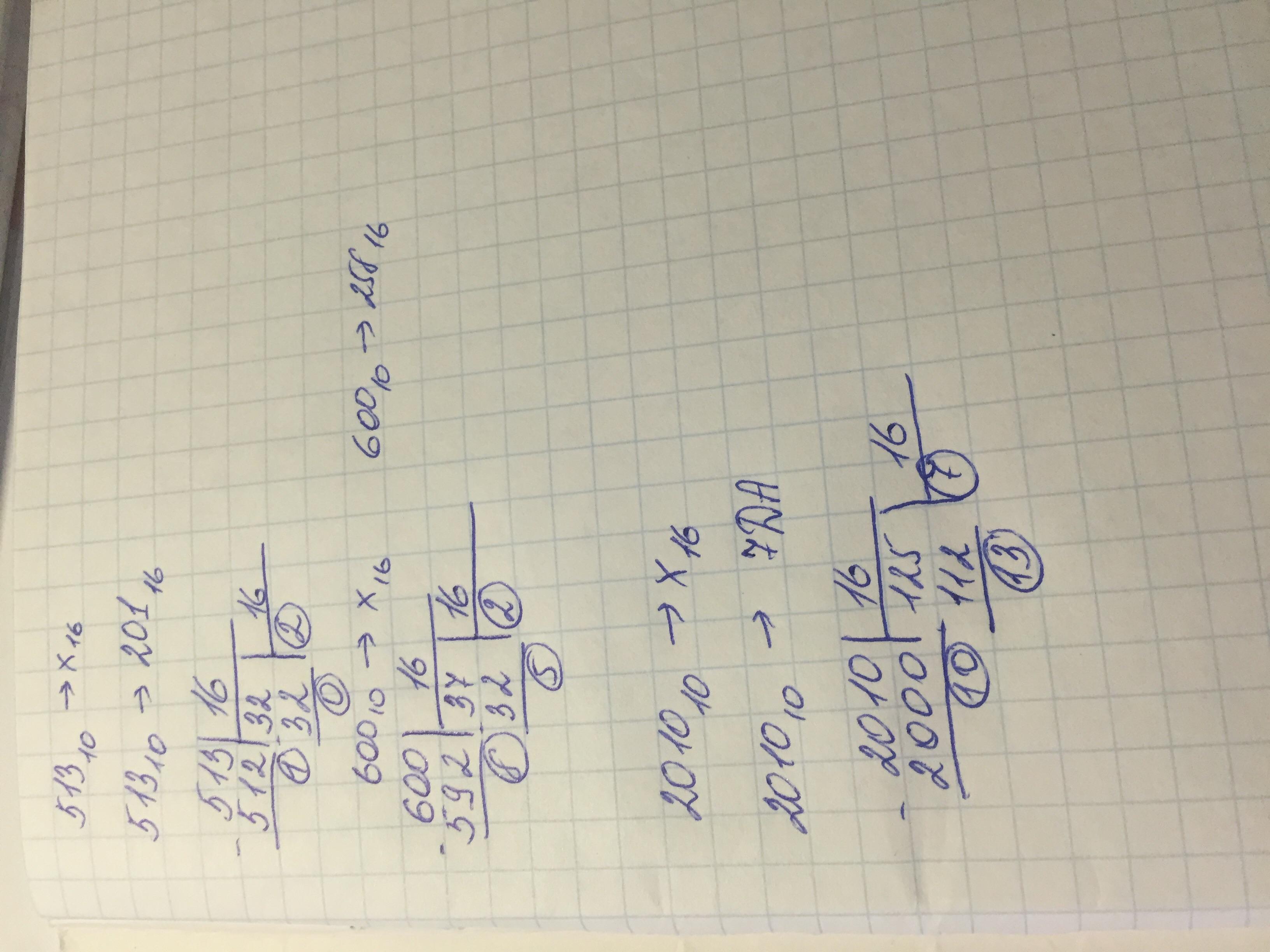 Перевести целые числа из десятичной системы счисления в шестнадцатью :513,600,2010. За ранее спасибо.