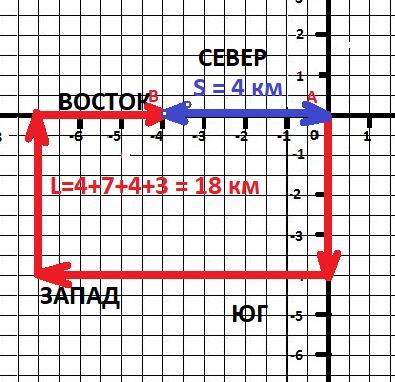 ОТВЕТ: Прошел 18 км, а сместился всего на 4 км (на запад).