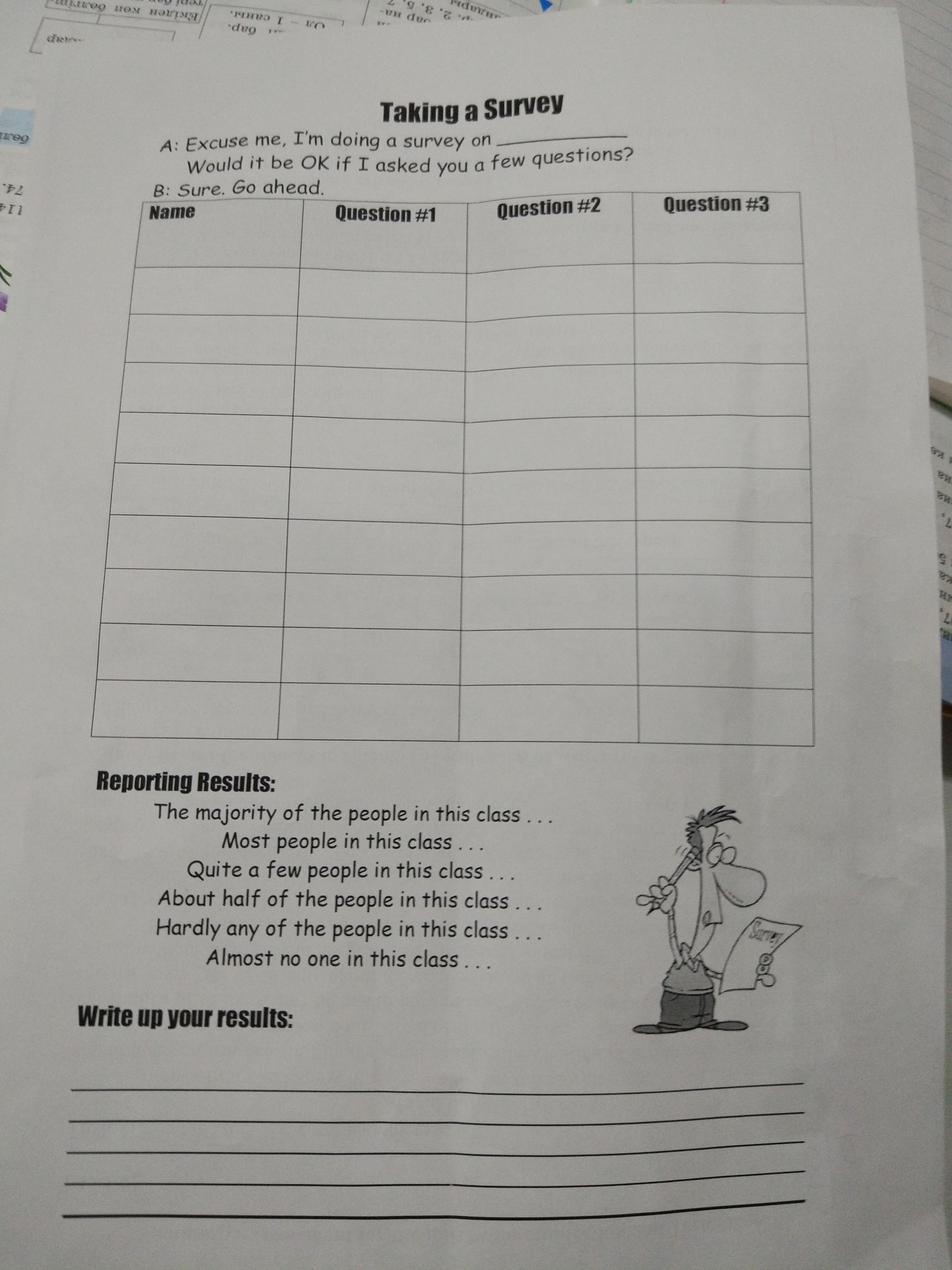 Ты должен у человека спросить 3 вопроса, записать его имя и ответы, вопросы над столбиком