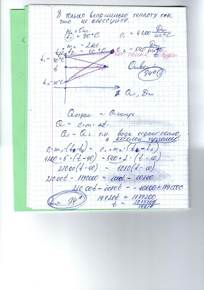 Помогите пожалуйста с задачами по физике ("-градусы)? Воду массой 5 кг при 90"С влили в чугунный котелок массой 2 кг при температуре 10"С.Какова стала температура воды?