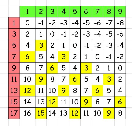 После того, как Сова подарила все чётные билеты, у неё осталось 9 нечётных. Значит, она должна подарить Ворону 2 билета. Составим таблицу, где сверху отметим все возможные значения числа М (зелёный цвет на рисунке), слева - номера билетов (розовым), а в поле таблицы - результат вычитания. Жёлтым отмечены результаты, которые делятся на три.