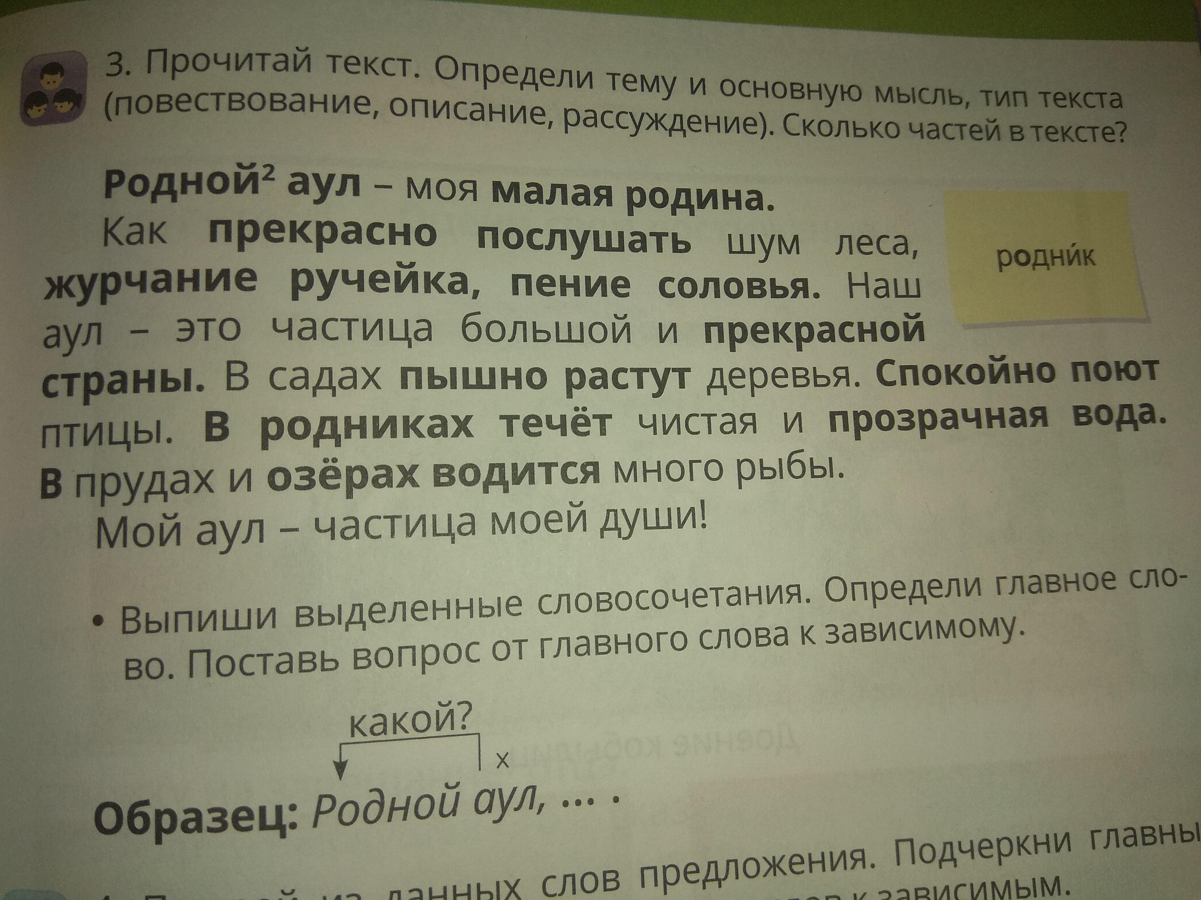 тип текста:описание. Тема: Рассказ о родном ауле. Мысль:Как прекрасна прерода аула. В тексте 3 части.