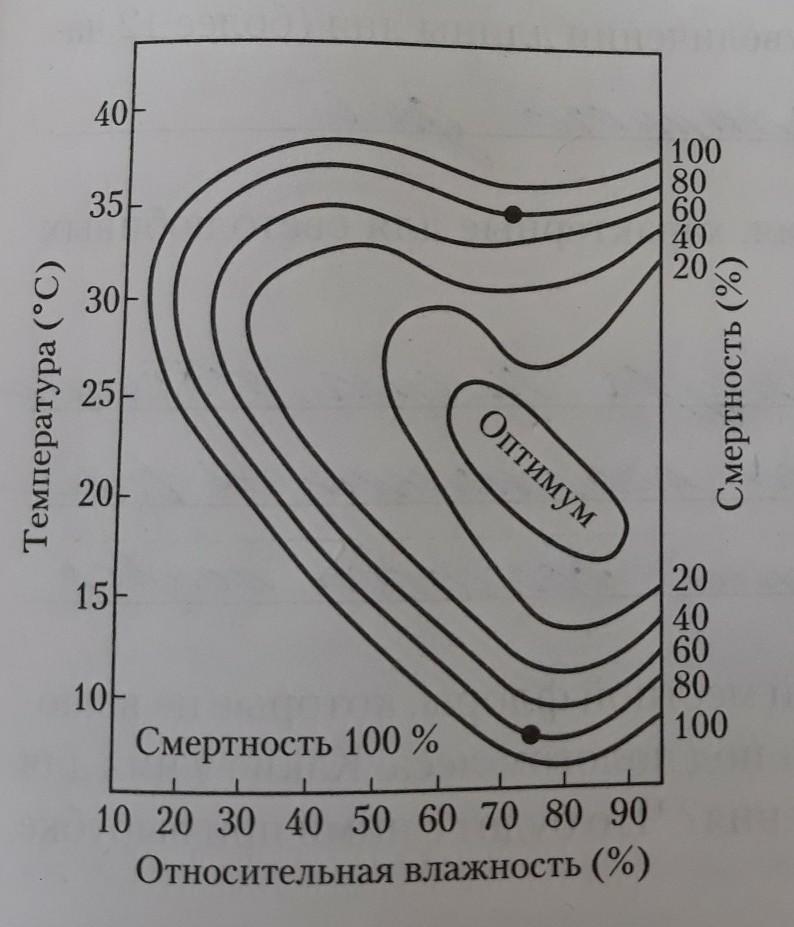 Используя график зависимости смертности куколок яблонной плодорожки от 2-ух факторов- температуры и влажности, постройте график зависимости смертности куколок от действия температуры при относительной влажности 30%