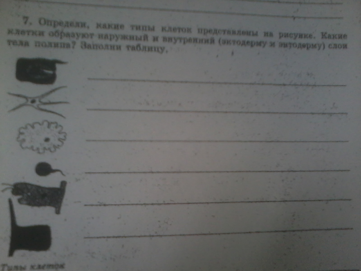 определи какие типы клеток представлены на рисунке. какие клетки образуют наружный и внутренний слои тела полипа? заполни таблицу
