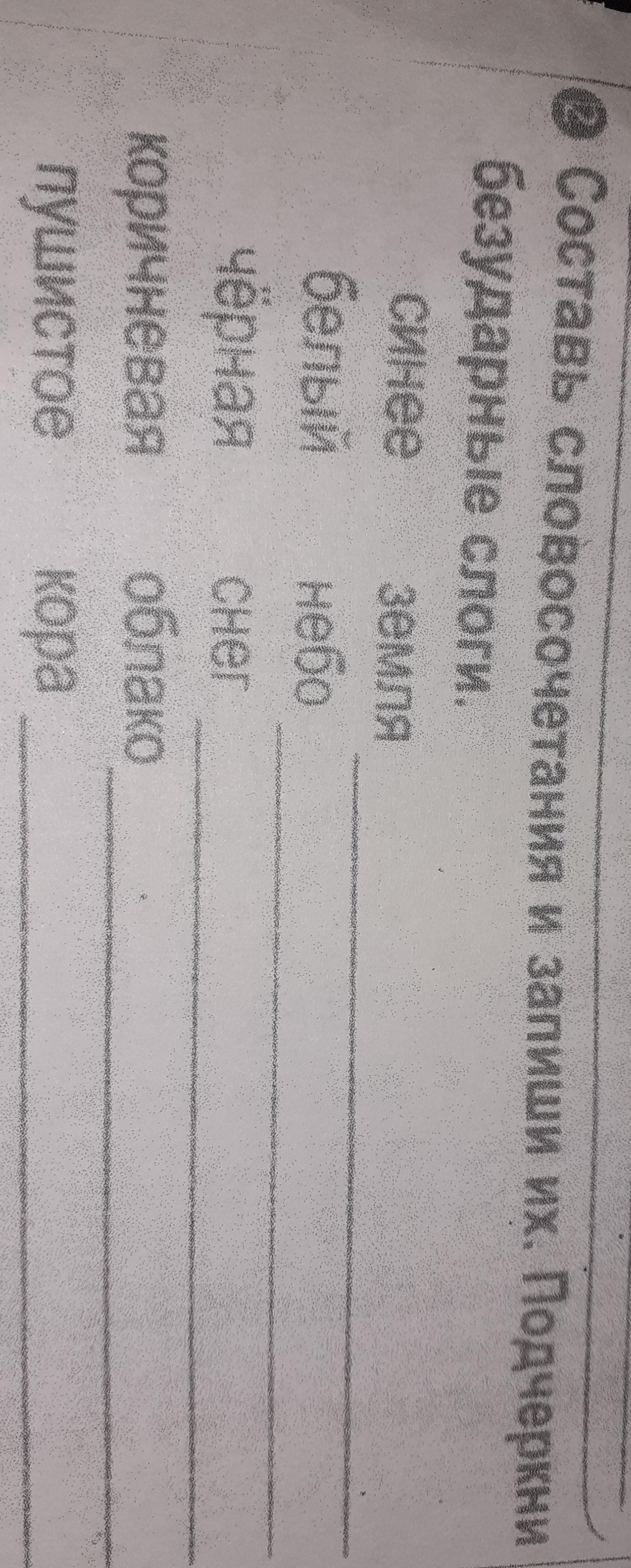 сорян не так.вот правильно. синие небо. белый снег. чёрная земля. коричневая кора. пушистое облако.