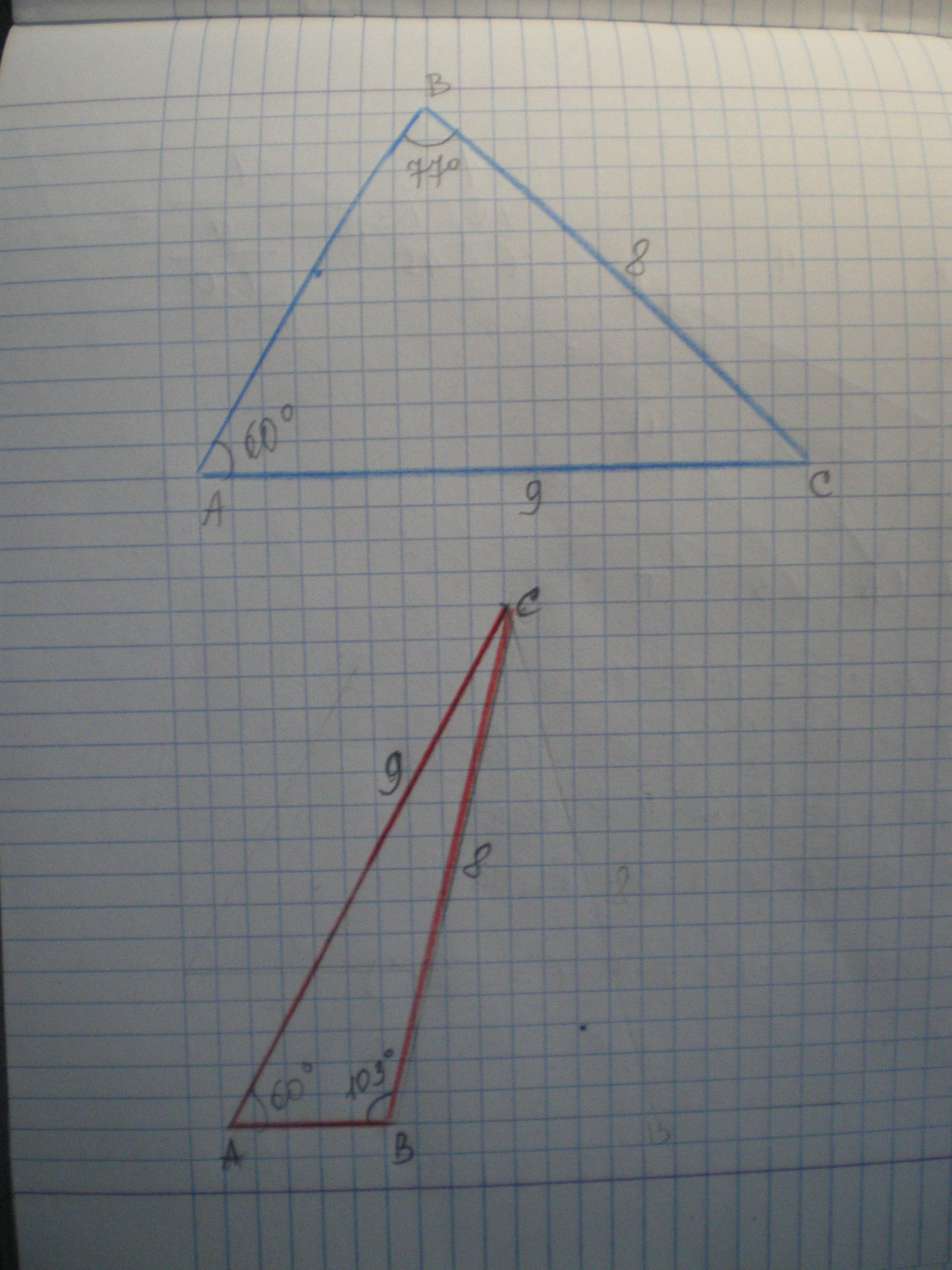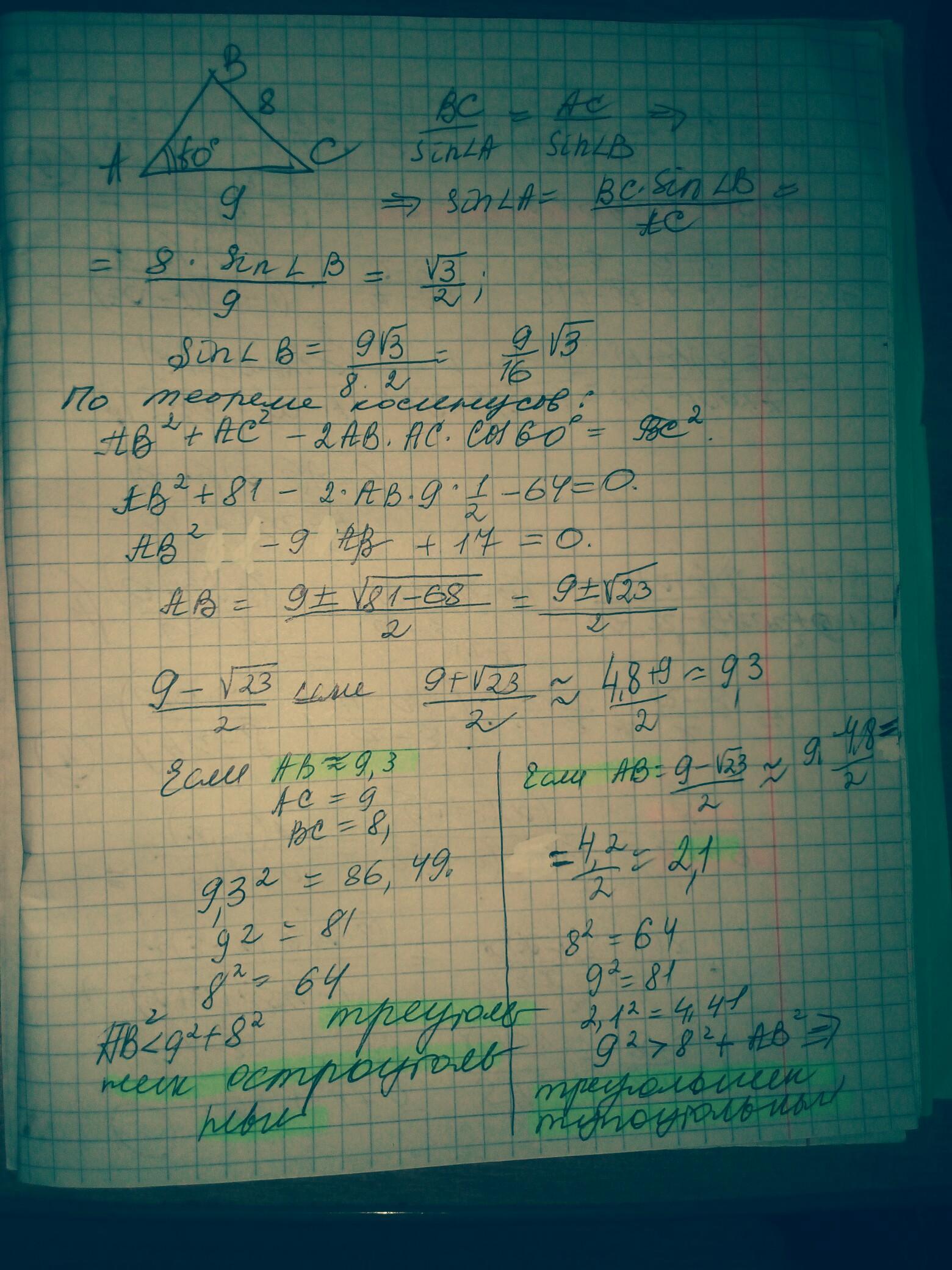 Какой вид (по величине углов) может иметь треугольник ABC , если BC=8 см, AC=9 см, ∠A=60∘ ?