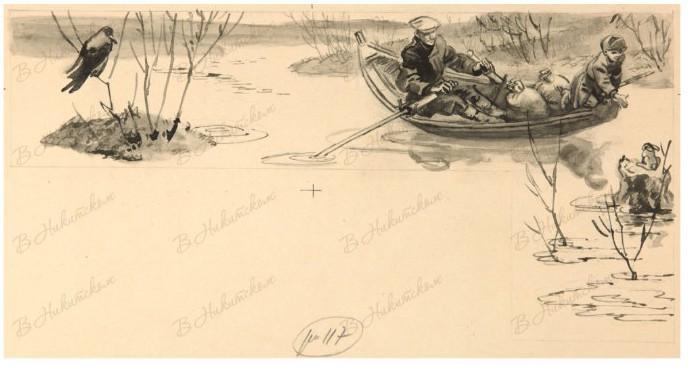На картинке мы видем отца и мальчика который на лодке переплывают болото либо реку. В этом болоте присуствует бугорки, а из этих бугарков растут ветки. Так же пенёк стоит рядом с лодкой. И мы видим что отце мальчика гребёт лодку.
