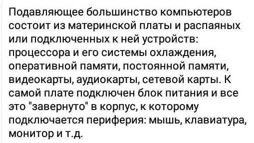 Ответ: блок питаня,жесткий диск,дисковод,материнская плата,процессор,система охлаждения,оперативная память,видеокарта звуковая карта,модом,тв-тюнер
