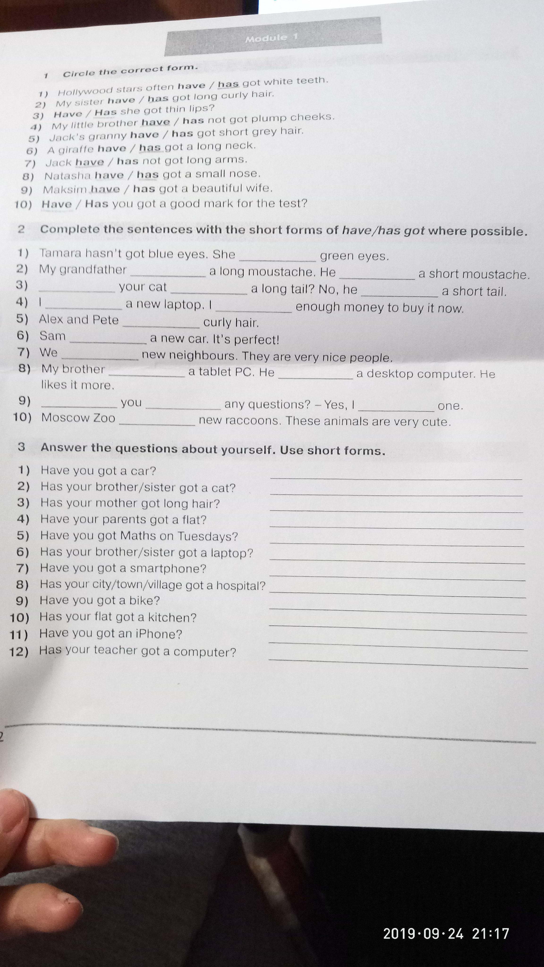 1) У тебя есть машина? 2) У твоего брата / сестры есть кошка? 3) У твоей мамы длинные волосы? 4) У ваших родителей есть квартира? 5) Есть ли у вас математику по вторникам? 6) У вашего брата / сестры есть ноутбук? 7) У вас есть смартфон? 8) Есть ли в вашем городе / поселке / деревне больница? 9) У тебя есть велосипед? 10) Есть ли в вашей квартире кухня? 11) У тебя есть iPhone? 12) У вашего учителя есть компьютер?