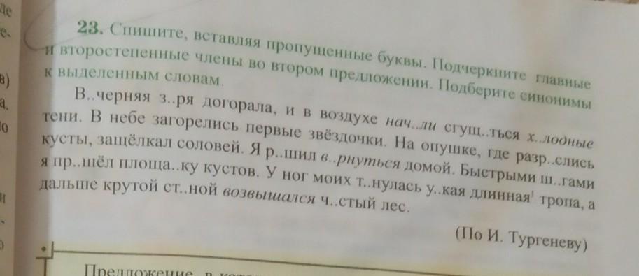 Вечерняя заря догорала, и в воздухе начали сгущаться холодные тени. В небе (_._. Обстоят.) загорелись (= сказуемое) первые (~ определ.) звёздочки (- подлежащ.). На опушке, где разрослись кусты, защёлкал соловей. Я решил вернуться домой. Быстрыми шагами я прошёл площадку кустов. У ног моих тянулась узкая длинная тропа, а дальше крутой стеной возвышался чистый лес.