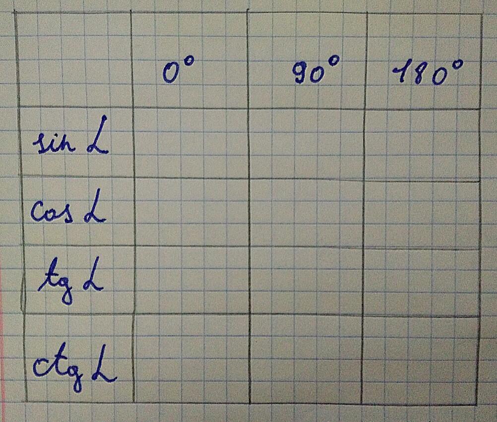 Зачем нужна таблица? Дело в том,чтобы быстрей вспомнить значения тригонометрических функций,например: sin 0° = 0 или cos 180°= -1