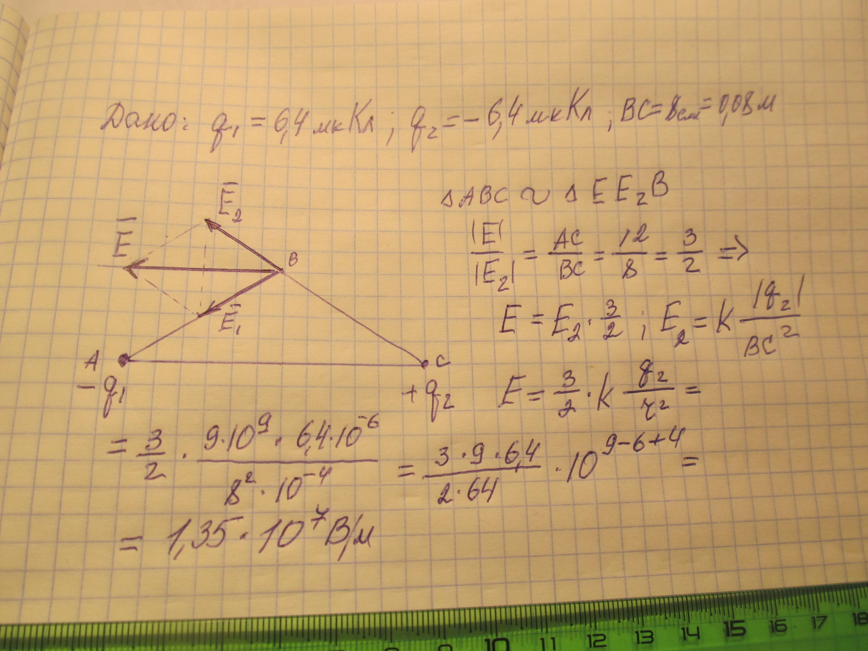 Відстань між двома точковими зарядами +6,4 мкКл і –6,4 мкКл дорівнює 12 см. Визначити величину напруженісті поля у точці, віддаленій на 8 см від кожного із зарядів.