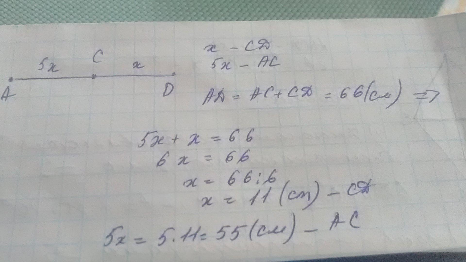 точка C лежить між точками А і D. Відрізок АС у 5 разів більший від відрізка СD. Знайдіть довжину відрізка АС, якщо АD = 66 дм