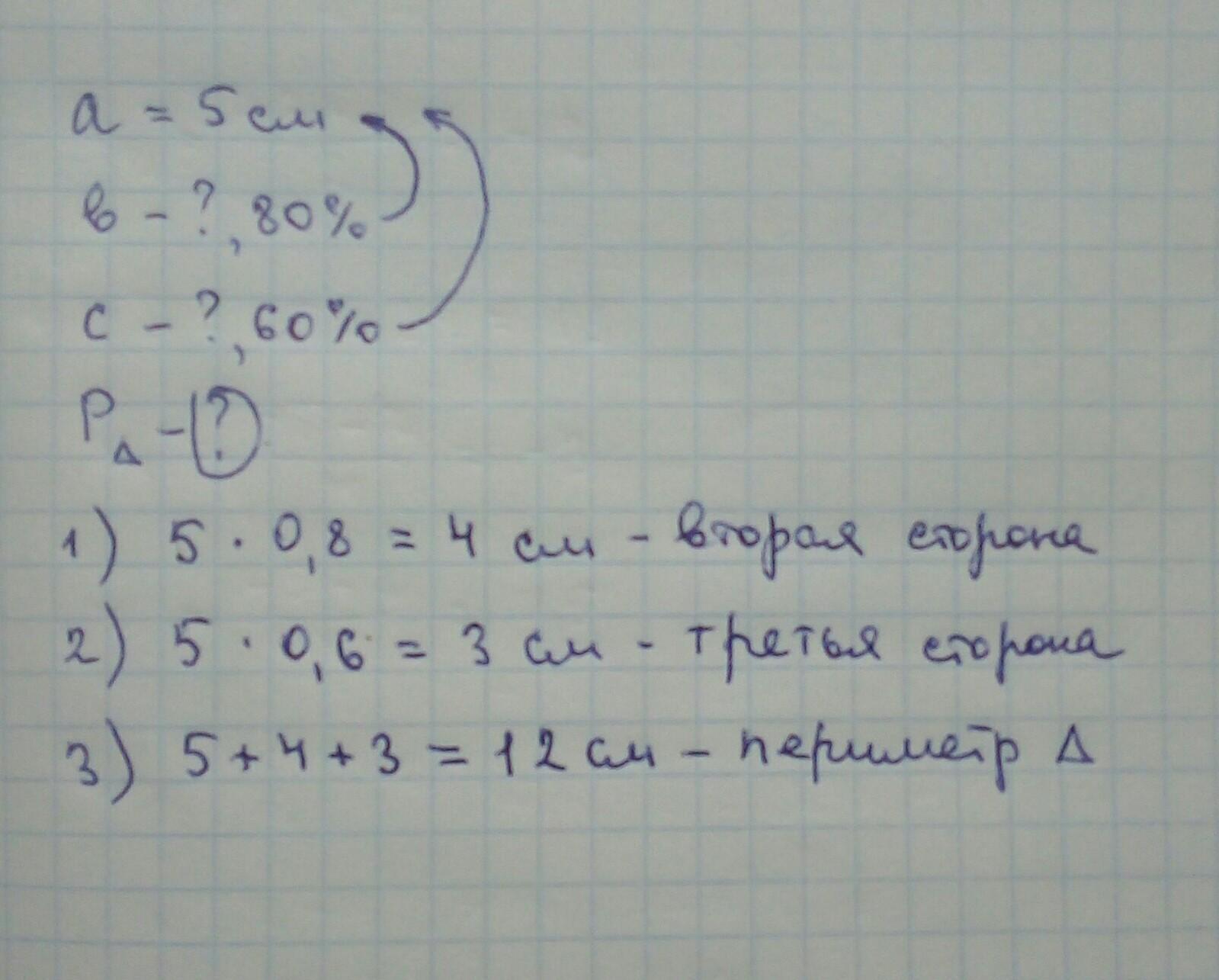 Дина олай строны треугольника равна 5 см, вторая торонв срстовляе 80% от первой треття С торона 60% ол первой. Найдмте периметр триугольника. Реьят помогите пожплуйста срочно нужно