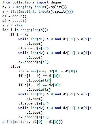 С каждым днем приближается зима и Макс измеряет температуру за окном уже N дней подряд, ежедневно записывая в тетрадь температуру. Максу стало интересно, какой максимальный перепад температур был в любом непрерывном отрезке, состоящем из K дней. Перепадом температур Макс считает разность максимальной и минимальной температуры.