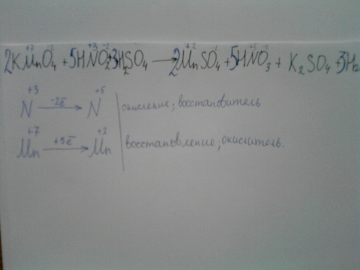 KMnO4+HNO2+SO4=MNSO4+HNO3+K2SO4+H2O расставить коэффииценты и определить где окислитель и восстановитель а также составить схему химического баланса