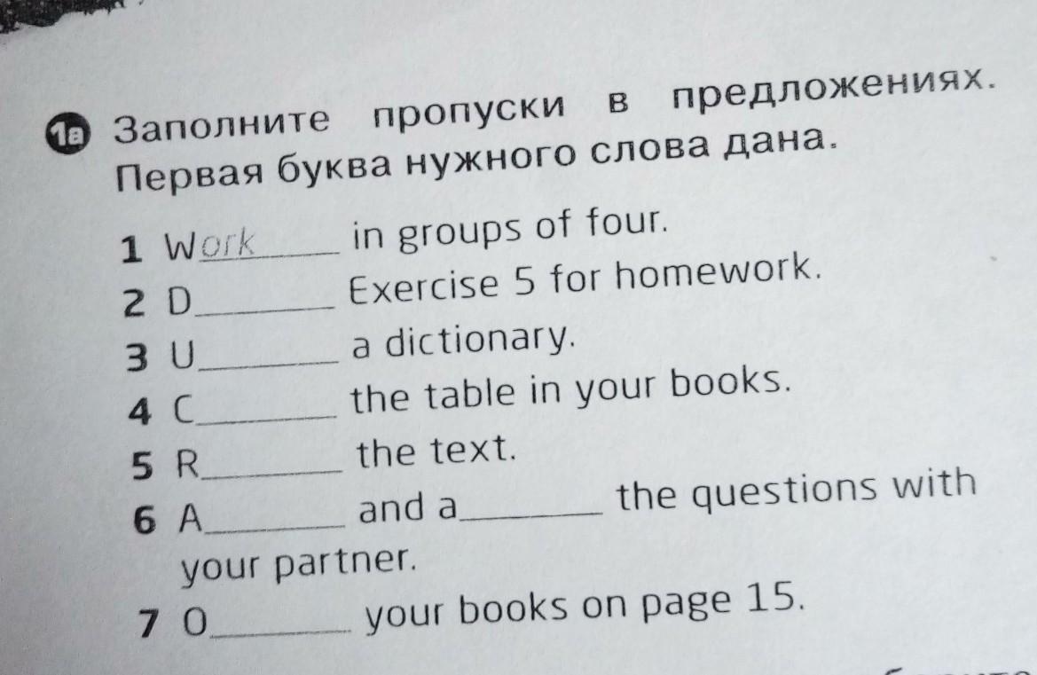 Ответ:1)work 2)Do 3)Use 4)- 5)read 6)ask and answer 7)open