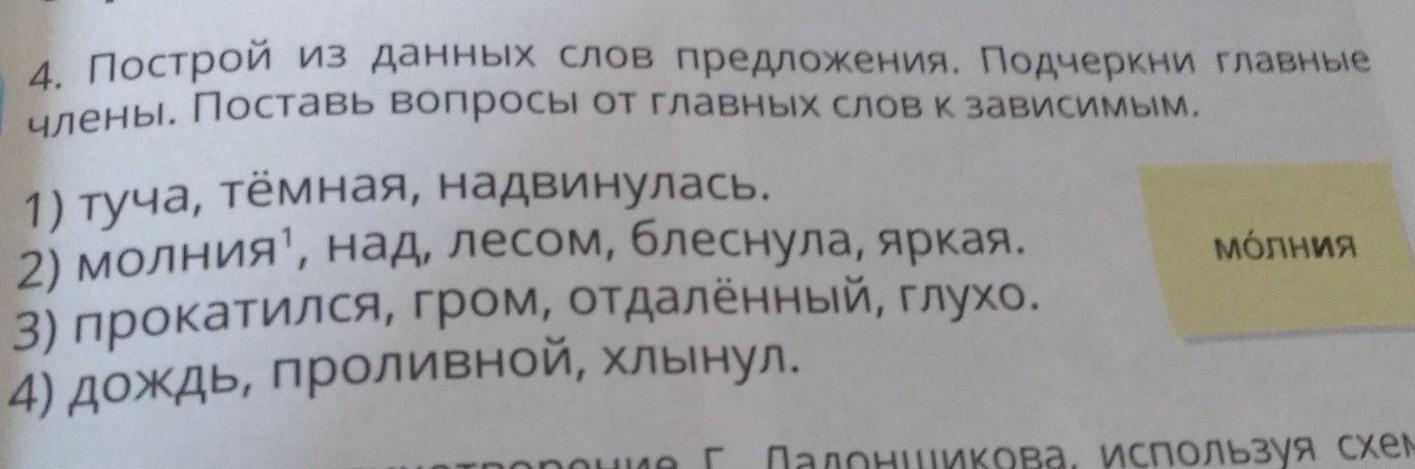 (Молния- подл, блеснула- сказ, яркая- опред, над лесом- дополнение)