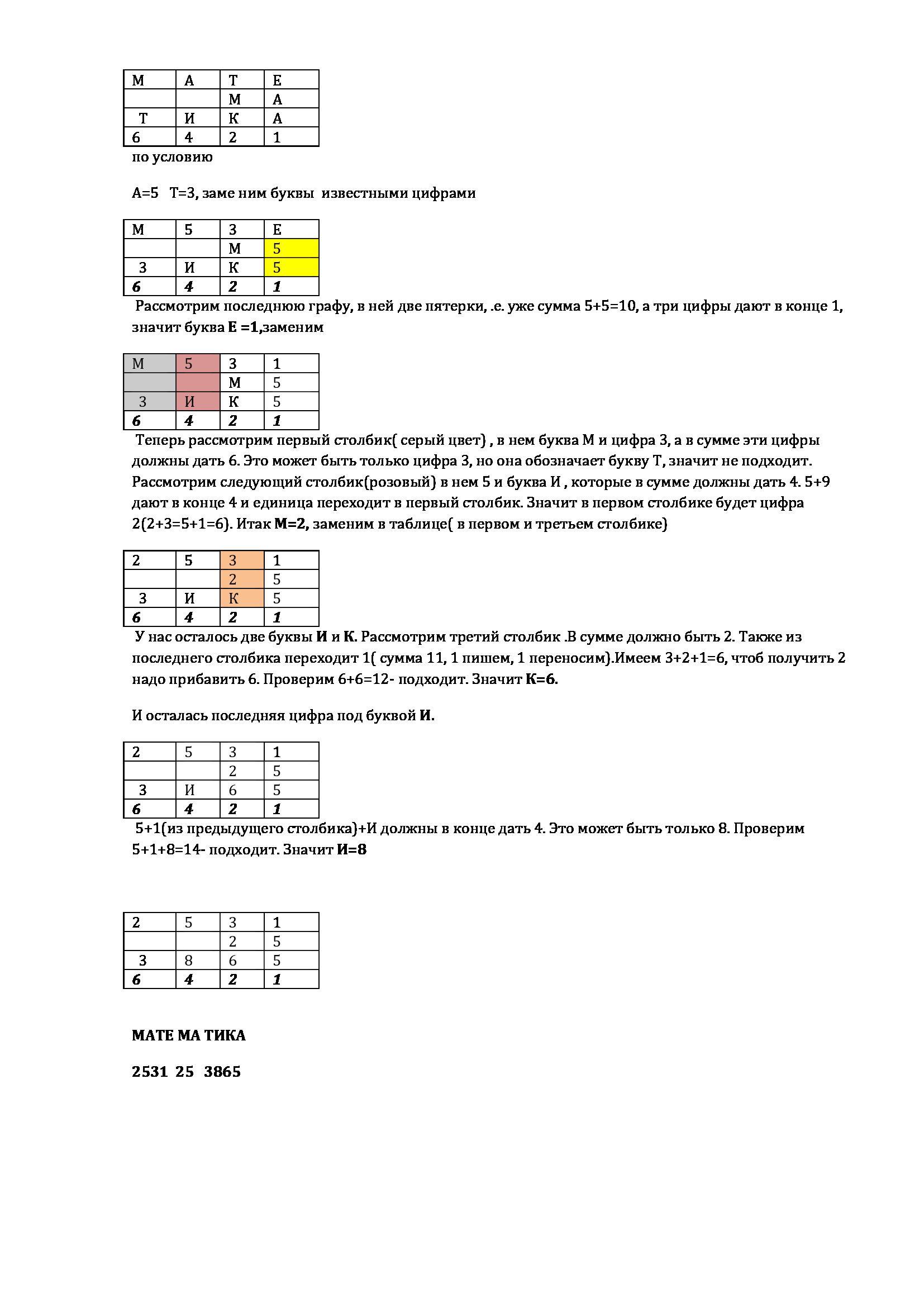В примере на вычитание учитель математики вставил одинаковые буквы вместо одинаковых цифр,а разные буквы вместо разных цифр. У него получилось МАТЕ+МА+ТИКА=6421. Укажите,какие цифры должны стоять вместо вставленных букв,если известно,что цифру 5 он заменил буквой А,а цифру 3 буквой Т. Прошу написать решение примером :с ПОМОГИТЕ(