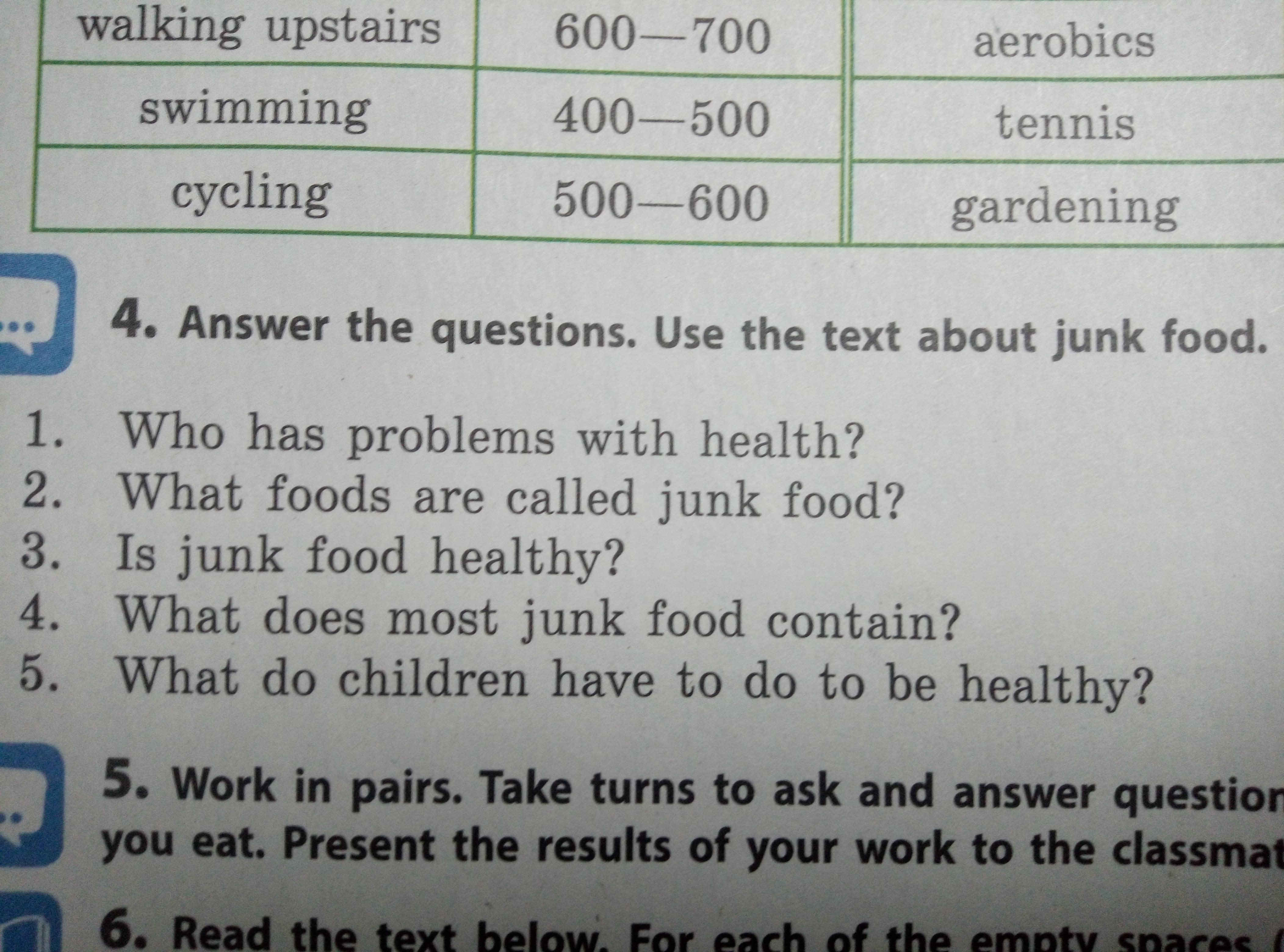 1. У кого проблемы со здоровьем? 2. Какие продукты называются нездоровой пищей? 3. Полезна ли вредная пища? 4. Что содержит большинство вредной пищи? 5. Что должны делать дети, чтобы быть здоровыми?